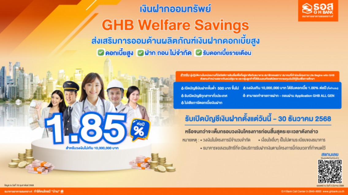 ธอส. เอาใจคนรักการออม กับ เงินฝากออมทรัพย์ GHB Welfare Savings ให้ผลตอบแทนอัตราดอกเบี้ยสูงถึง 1.85% ต่อปี