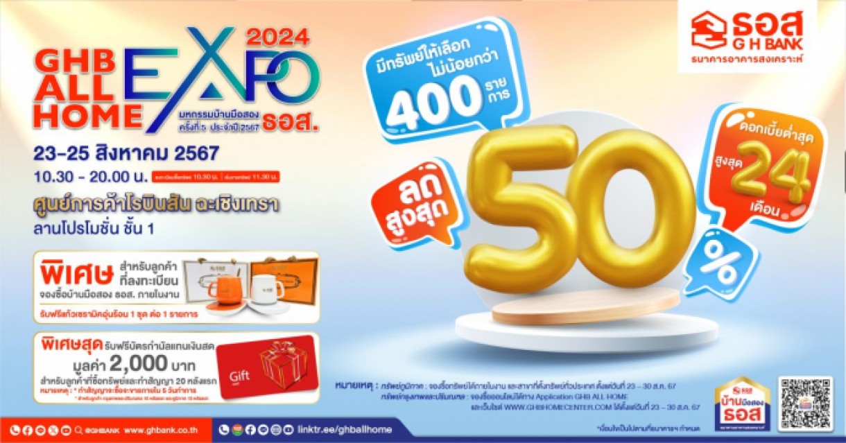 ธอส. เอาใจคนอยากมีบ้าน จัดงาน GHB ALL HOME EXPO 2024 ครั้งที่ 5 @โรบินสัน ฉะเชิงเทรา นำทรัพย์บ้านมือสองคุณภาพดีกว่า 400 รายการ พร้อมลดสูงสุด 50%