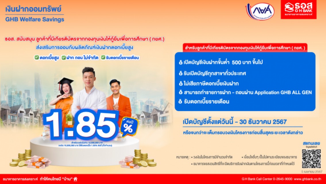ธอส. MOU กยศ. โครงการสนับสนุนผู้กู้ยืมเงินกองทุนฯ ให้มีที่อยู่อาศัยเป็นของตนเอง จัดทำสินเชื่อบ้านอัตราดอกเบี้ยต่ำปีที่ 1 เพียง 2.60% ต่อปี พร้อมเงินฝากอัตราดอกเบี้ยพิเศษสูงถึง 1.85% ต่อปี