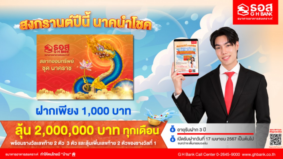 ธนาคารอาคารสงเคราะห์ เปิดตัว สลากออมทรัพย์ ชุด “นาคราช” หน่วยละ 1,000 บาท อายุสลาก 3 ปี ผลตอบแทนหน้าสลากสูงถึง 1.00% ต่อปี ลุ้นรับเงินรางวัลมูลค่า 2 ล้านบาท ตลอด 36 งวด เริ่มรับฝากตั้งแต่วันที่ 17 เมษายน 2567 และออกรางวัลครั้งแรก วันที่ 16 พฤษภาคม 2567 จำหน่ายผ่านช่องทาง Mobile Application : GHB ALL GEN และ ธอส. ทุกสาขาทั่วประเทศ
