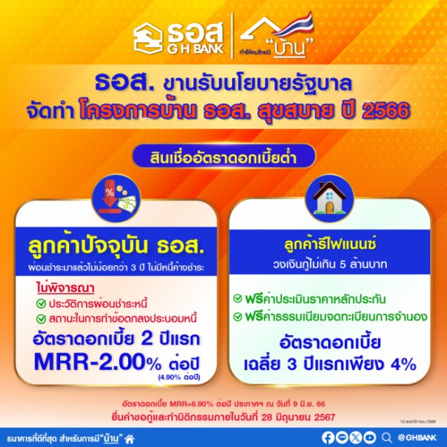 ธอส. ขานรับนโยบายรัฐบาล จัดทำโครงการบ้าน ธอส. สุขสบาย ปี 2566 ลดดอกเบี้ยให้ลูกค้าสินเชื่อบ้าน ช่วยเหลือคนไทยมีที่อยู่อาศัยง่ายขึ้น