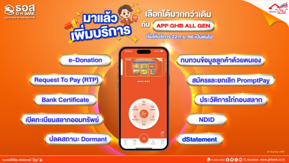 ธอส. เพิ่ม 10 ฟังก์ชันบริการใหม่ใน Application : GHB ALL GEN ตอกย้ำความเป็น Digital Bank เต็มรูปแบบ เริ่มให้บริการ 22 ก.ย. 66 เป็นต้นไป
