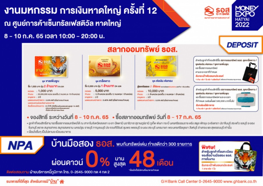 ธนาคารอาคารสงเคราะห์(ธอส.) ร่วมงานมหกรรมการเงินหาดใหญ่ ครั้งที่ 12 Money Expo Hatyai 2022 ขนโปรโมชั่นเอาใจพี่น้องชาวใต้ นำโดยสินเชื่อบ้านอัตราดอกเบี้ยต่ำปีแรก MRR-3.55% (2.60%) ต่อปี พิเศษ!! พบกับสินเชื่อช่วง Golden Minute อัตราดอกเบี้ยต่ำสุดๆ ปีแรกไม่ถึง 1% ต่อปี และพบกับสลาก ออมทรัพย์ ธอส. ลุ้นรางวัลสูงสุดถึง 2 ล้านบาท บ้านมือสองคุณภาพดีกว่า 300 รายการ ลดสูงสุด 40% ราคาขายต่ำสุดเพียง 160,000 บาท พร้อมลุ้นรับของที่ระลึกมากมาย จัดขึ้นวันที่ 8-10 กรกฎาคม 2565 ณ ศูนย์การค้าเซ็นทรัลเฟสติวัล หาดใหญ่