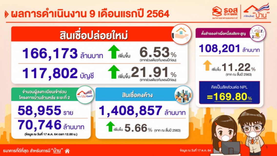 ธนาคารอาคารสงเคราะห์ เปิดผลการดำเนินงานในช่วง 9 เดือนแรกของปี 2564 ปล่อยสินเชื่อใหม่ได้ 166,173 ล้านบาท 117,802 บัญชี เพิ่มขึ้น 6.53% จากช่วงเดียวกันของปี 2563 สินเชื่อคงค้างรวม 1,408,857 ล้านบาท สินทรัพย์รวม 1,455,358 ล้านบาท มีหนี้ที่ไม่ก่อให้เกิดรายได้ (NPL) 4.52% และมีเงินสำรองจำนวน 108,201 ล้านบาท คิดเป็นสัดส่วนต่อ NPL สูงถึง 169.80% ขณะที่ผู้ลงทะเบียนโครงการ บ้านล้านหลัง ระยะที่ 2 ล่าสุด ณ วันที่ 17 ตุลาคม 2564 อยู่ที่ 58,955 ราย คิดเป็นวงเงินสินเชื่อ 70,746 ล้านบาท พร้อมช่วยเหลือลูกค้าที่ได้รับผลกระทบจาก COVID-19 อย่างต่อเนื่อง โดยนับตั้งแต่ปี 2563 ถึงปัจจุบันเป็นระยะเวลา 21 เดือน มีจำนวนลูกค้าเข้ามาตรการช่วยเหลือของ ธอส. รวมสูงสุดถึง 968,555 บัญชี เงินต้นคงเหลือ 842,056 ล้านบาท