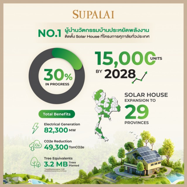 • บริษัท ศุภาลัย จำกัด (มหาชน) ผู้นำด้านอสังหาริมทรัพย์ เดินหน้าจับมือพันธมิตรผู้นำด้านเทคโนโลยีพลังงานสะอาด บริษัท หัวเว่ย เทคโนโลยี่ (ประเทศไทย) จํากัด และบริษัท ไอออน เอนเนอร์ยี่ คอร์ปอเรชั่น จำกัด ลุยติดตั้ง “โซลาร์เซลล์” บ้านพร้อมขายทั่วประเทศ ตอกย้ำ...แบรนด์อันดับหนึ่ง ด้านนวัตกรรมบ้านประหยัดพลังงาน • วางโรดแมพ 5 ปี (2567-2571) ยกระดับสู่บ้านประหยัดพลังงานทั่วประเทศ ลุยติดตั้ง “โซลาร์เซลล์” 15,000 หลังคาเรือน และติดตั้ง ณ สำนักงานขาย และบ้านตัวอย่าง สโมสรส่วนกลาง โครงการที่อยู่อาศัยของศุภาลัยทั่วประเทศ • ผลักดันเต็มสูบ...สู่การเป็นองค์กรที่มุ่งสู่ความยั่งยืน และให้ความสำคัญด้านสิ่งแวดล้อม โดยตั้งเป้าหมายระยะกลาง ลดการปล่อยก๊าซเรือนกระจก 40 % ภายในปี 2573 พร้อมแผนรองรับที่ปฏิบัติจริง ทำได้จริง