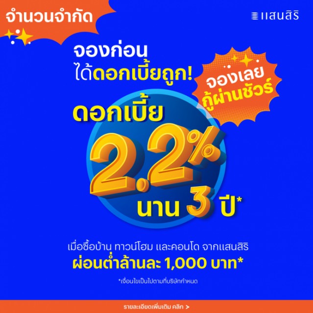 o ล่าสุด ชูอัตราดอกเบี้ยดีที่สุดในตลาด และเป็นรายเดียวในอสังหาฯ ที่ให้อัตราดอกเบี้ยต่ำที่สุดเพียง 2.2% ก่อนแนวโน้มอัตราดอกเบี้ยขาขึ้นรับเงินเฟ้อ พร้อมโอกาสสุดท้าย! บ้านเดี่ยว ทาวน์โฮม ลดเพิ่มทันทีสูงสุด 100,000 บาท คอนโดฯ ฟรีค่าส่วนกลางสูงสุด 5 ปี** พร้อมอัตราดอกเบี้ยดี ถึง 30 เม.ย. นี้