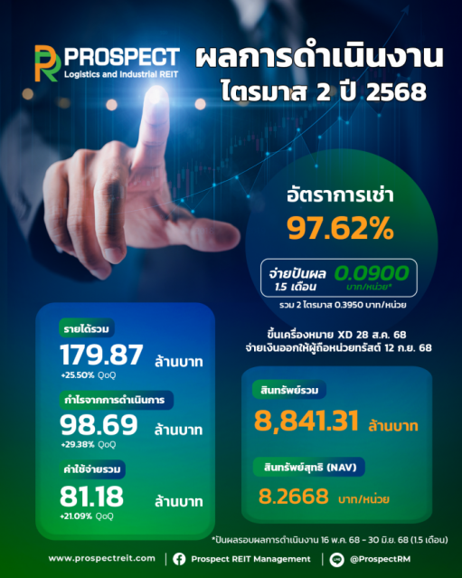 PROSPECT REIT ชูไตรมาส 2/2568 มาแรง อัตราการเช่าทะยาน 97.62% ครึ่งปีแรกจ่ายปันผล 0.3950 บาทต่อหน่วย ปักธงโตต่อเตรียมขออนุมัติลงทุนเพิ่มเติม
