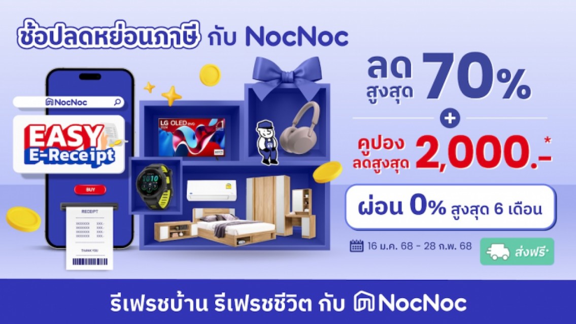 โค้งสุดท้าย ช่วงช้อปที่คุ้มที่สุดแห่งปี ! ‘NocNoc’ ชวนช้อปสินค้าและอุปกรณ์ตกแต่งบ้านกับแคมเปญ ‘Easy e-Receipt 2.0’เสิร์ฟความคุ้ม 3 ต่อ แถมได้ลดหย่อนภาษี ถึง 28 กุมภาพันธ์ 68 นี้เท่านั้น
