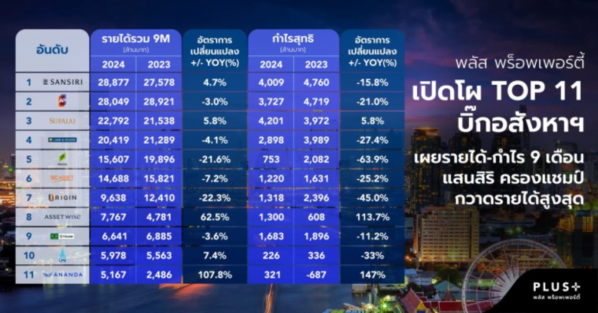 พลัส พร็อพเพอร์ตี้ เปิดโผ TOP 11 บิ๊กอสังหาฯ เผยรายได้-กำไร 9 เดือน ‘แสนสิริ’ ครองแชมป์กวาดรายได้สูงสุด
