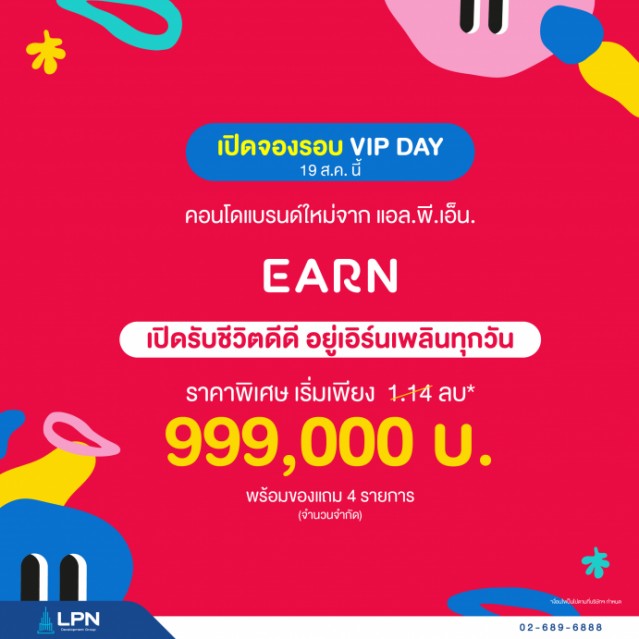 LPN ผุดคอนโดแบรนด์ใหม่ EARN CONDO รุกย่านนิคมอมตะชลบุรีเจาะกลุ่มนักลงทุนและเรียลดีมานด์ เปิดรอบ VIP DAY ให้จองก่อนใคร ในราคาพิเศษ 999,000 บาท* พร้อมรับของแถมฟรี 4 รายการ 19 ส.ค.นี้ วันเดียวเท่านั้น!