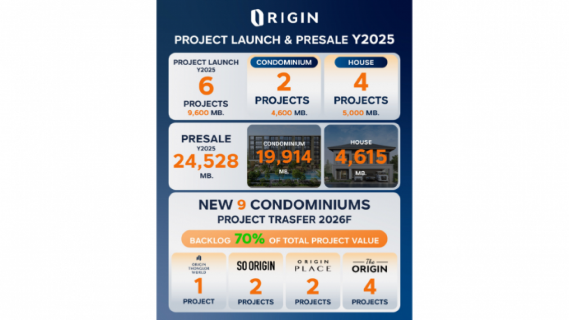 ออริจิ้น โชว์ยอดขายบ้าน-คอนโดฯ ปี 2568 กว่า 24,500 ล้านบาท ปี 2569 จ่อโอนคอนโดฯเพิ่มอีก 9 โครงการ ตุน Backlog แล้วกว่า 70% ของมูลค่าโครงการ