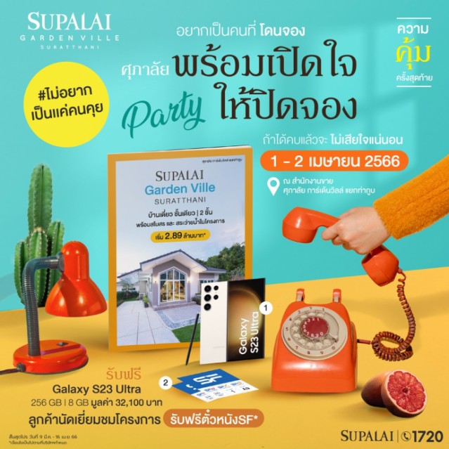 บริษัท ศุภาลัย จำกัด (มหาชน) เปิดบ้านชวนมาปาร์ตี้เพราะ #ไม่อยากเป็นแค่คนคุย พร้อมเปิดใจให้ ปิดจองกับโครงการศุภาลัย การ์เด้นวิลล์ สุราษฎร์ธานี บ้านเดี่ยวชั้นเดียวและ 2 ชั้น บนสุดยอดทำเลใกล้แยกท่ากูบและเซ็นทรัล ราคาเริ่มต้น 2.89 ล้านบาท จัดเต็ม!! โปรโมชันแบบคุ้มจนใจเจ็บทั้งส่วนลดและของแถม ภายในงานวันที่ 1 - 2 เม.ย. 66