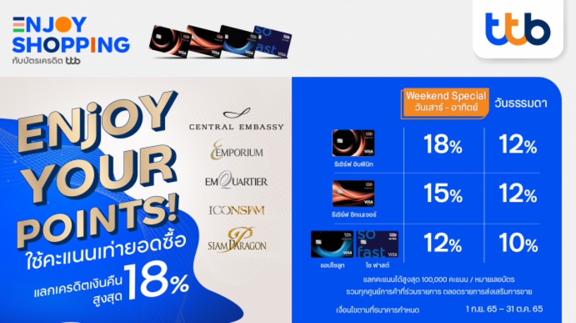 บัตรเครดิต ทีทีบี มอบสิทธิพิเศษเครดิตเงินคืนสูงสุด 18% เมื่อใช้คะแนนสะสมแลกเท่ายอดใช้จ่ายที่ 5 ศูนย์การค้าดัง
