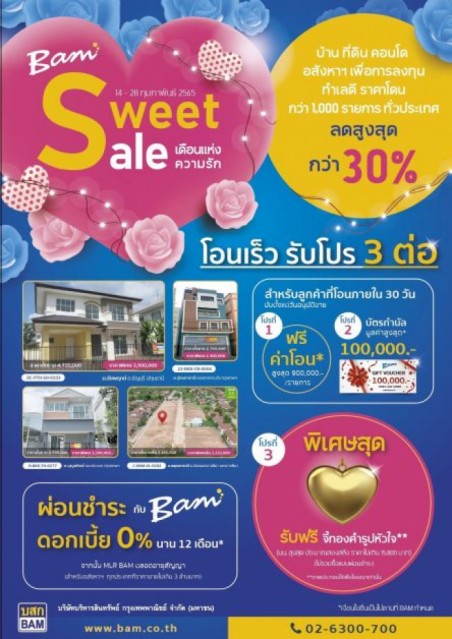 BAM อัดโปรโมชั่น "Sweet Sale เดือนแห่งความรัก" ซื้อทรัพย์ลดกว่า 30% ลูกค้า "โอนเร็ว รับโปร 3 ต่อ" ฟรีค่าโอนฯ -รับบัตรกำนัล-จี้ทองคำแท้รูปหัวใจ