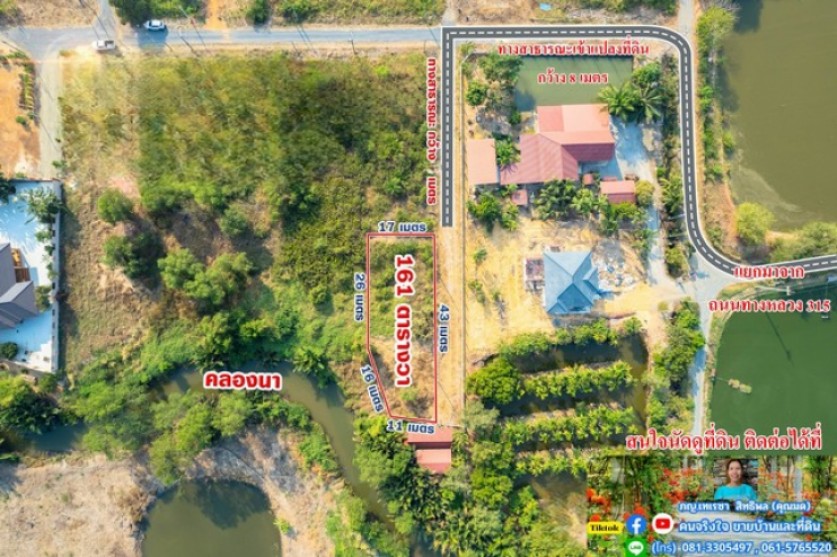 ขายที่ดิน 161 ตรว. ถมแล้วเต็มพื้นที่ ที่ดินมีรูปร่างสี่เหลี่ยมคางหมู มีด้านหน้าแปลงติดถนนสาธารณะ 43 เมตร และด้านหลังติดคลองธรรมชาติ ประมาณ 16 เมตร