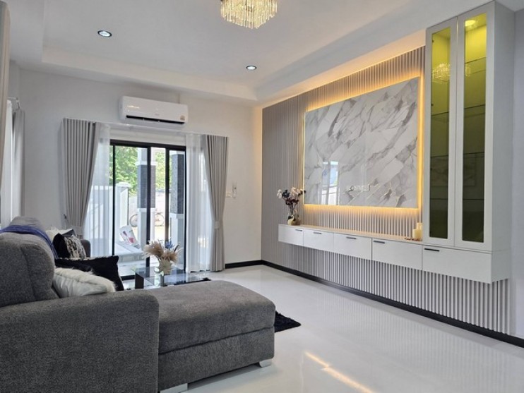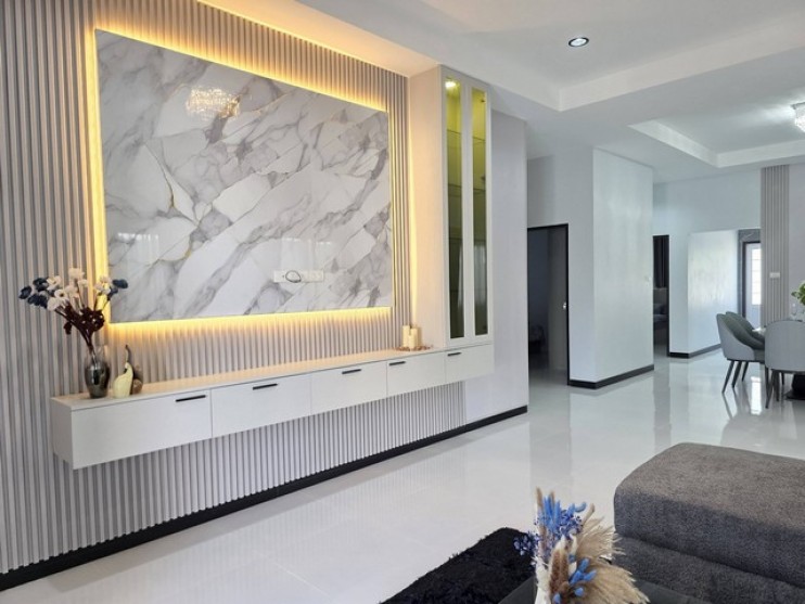 Newly built single house with a private swimming pool. 4.99 mil transfer 50/50 Land size: 58.7 sq.wah 3 bedrooms 2 bathrooms Spacious living area Separate kitchen Private swimming pool (chlorine system), 3×3 meters Parking space for 1–2 cars Automatic remote gate. Fully furnished and ready to move in: 4 air conditioners 55-inch TV Refrigerator 2 water heaters Gas stove with hood Water pump and 1,000-liter water tank Location: Huay Yai no. 81/33